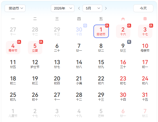 放假时间:2026年5月1日(周五)——2026年5月5(周二),共5天。